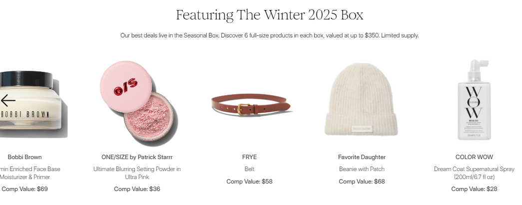 For example, according to My Subscription Addiction, the 2025 Winter box offered some options like the Hythe Bubble blanket, a Honeydew pajama set, a Bobbi Brown primer, an Ettika necklace, Eavie Beauty ashwaghanda supplements, and AG CARE conditioning mist detangling spray.