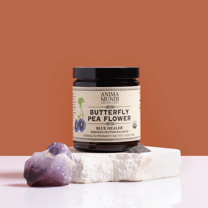 The Anima Mundi Butterfly Pea Flower Powder is a nervous system tonic that will turn this spa mojito water into a full calming experience.
